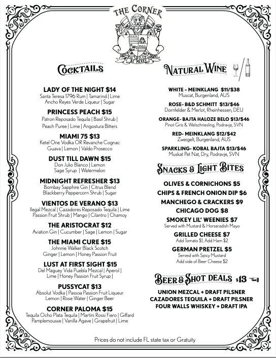 The Corner offers a menu that blends approachable casual bites with a well-curated selection of drinks, perfect for easygoing gatherings and relaxed evenings. You’ll find a thoughtful mix of snacks and small plates, like a classic Chicago Dog or a mixed charcuterie and cheese board, designed to complement the warm, inviting atmosphere of this Miami spot.